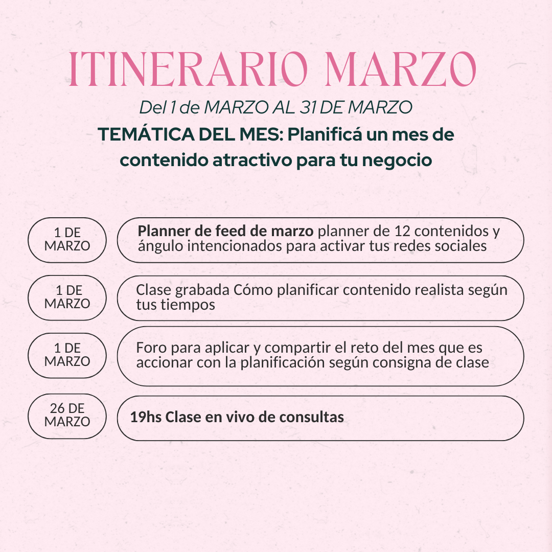 Cada mes trabajamos una temática diferente a veces en vivo y a veces grabadas (organización, contenido,historias,video, alcance, comunidad, etc) para que avances con foco y a tu ritmo